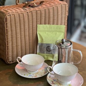 Our retro basket carrier with a set of tea cups and tea pot. Great for an outdoor gathering! Comes with our signature Beauty tea (10 bags)